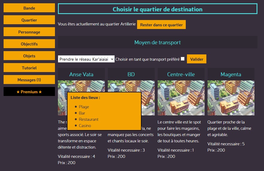 Les déplacements entre quartiers se font via le bouton "Changer de quartier". Il existe plusieurs façons de se déplacer dans la ville. Le plus commun étant la marche à pied, mais cela risque d'épuiser votre vitalité ! En fonction de votre moyen de transport, plus ou moins de vitalité et de Frôncs seront utilisés, à vous de faire votre choix.